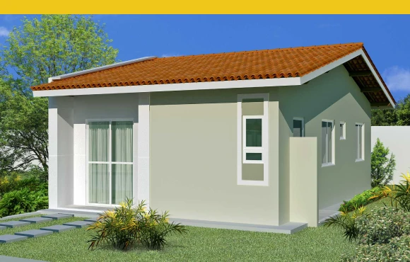 Casas térreas com 2 quartos sociais e estar/jantar com circulação.